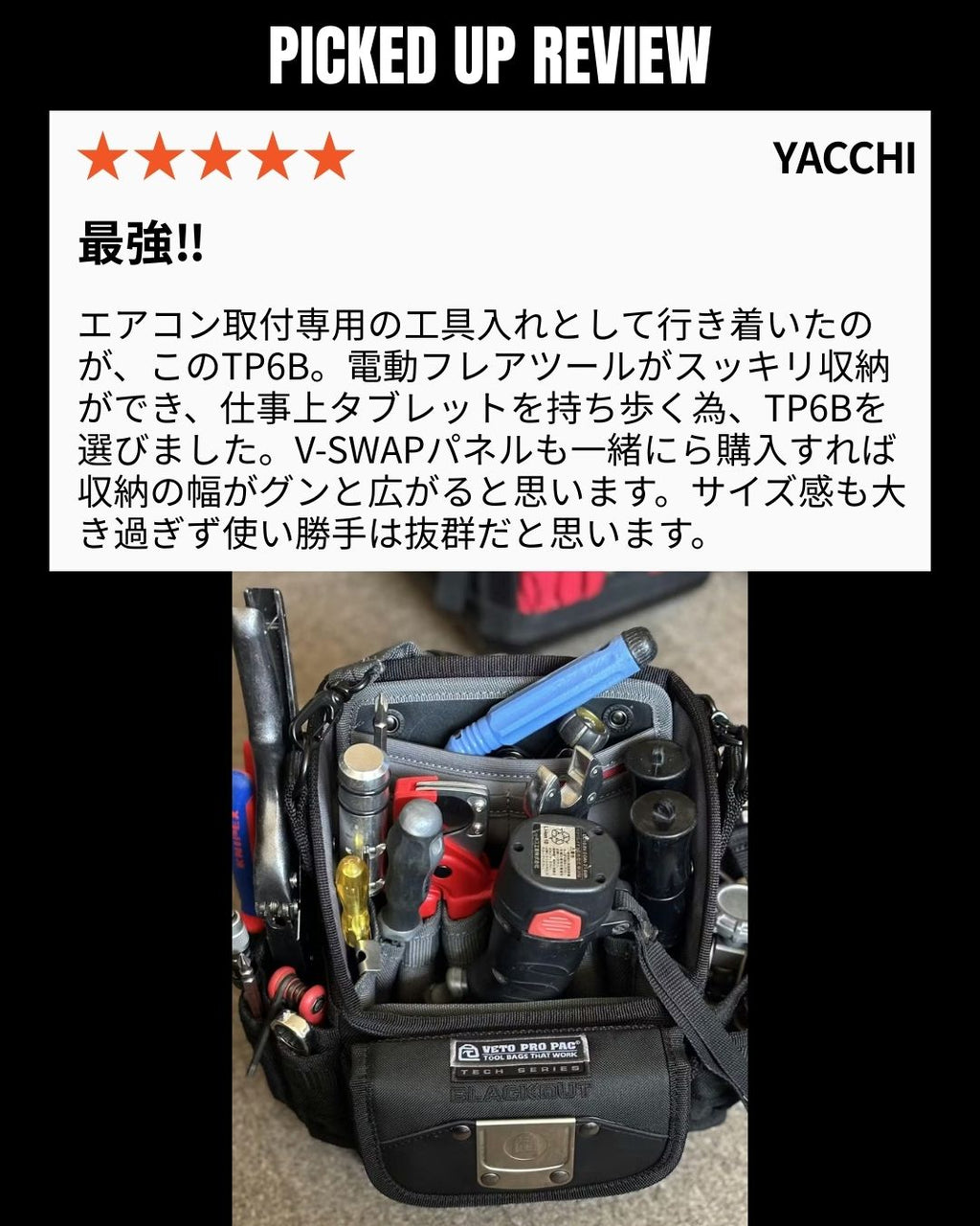 同タイプのツールポーチのTP3B、TP4B、TP5Bと比べると、高さは変わらずに、幅と奥行きが広くなったため、容量が最大級となってます。